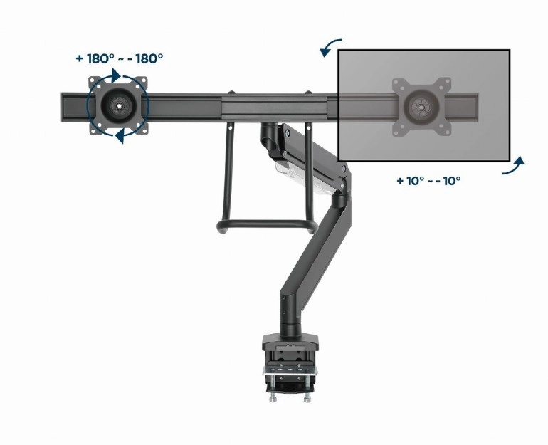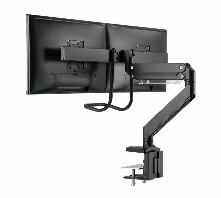 - Fleksibel justering – drejning, udtræk, højde og hældning for perfekt tilpasning af to skærme side om side.