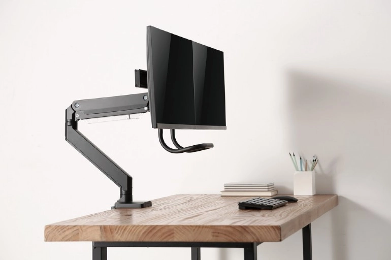 Dette dobbeltbeslag til skærme kombinerer slankt design og høj bæreevne til både professionelle og hjemmearbejdspladser. Armene drejer, trækkes ud, skubbes ind og vippes jævnt, så du nemt indstiller den ideelle læsevinkel og reducerer belastningen af nakke og ryg.
