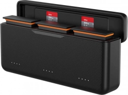 2-i-1 designet kombinerer en ladestation og et robust transportetui. Takket være magnetlukningen og den dedikerede plads til to TF (microSD) kort forbliver dit udstyr sikkert – også i felten. De kompakte mål passer perfekt i rygsækken – en ideel løsning til rejser og lange optagedage.