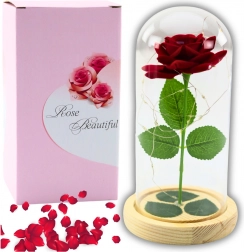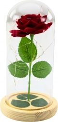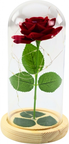 Denne evige røde rose efterligner troværdigt en ægte blomst og bevarer sit tidløse udseende uden støv og vedligeholdelse takket være glaskuplen. Den varme LED-belysning fremhæver arrangementets skønhed og forvandler dit hjem til et hyggeligt og romantisk sted.