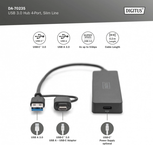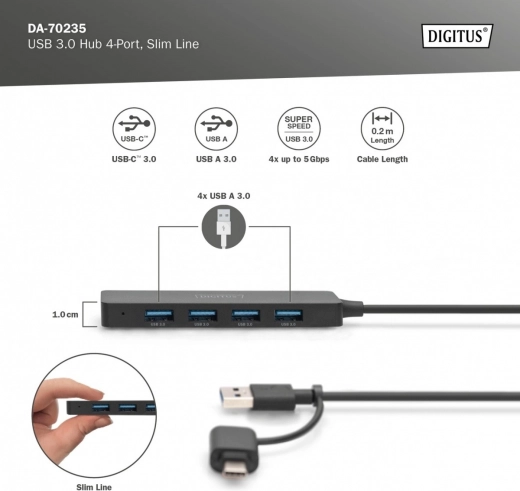 USB Hub 3.0 fra DIGITUS Slim Line er den perfekte løsning til at udvide tilslutningsmulighederne på enhver arbejdsplads. Denne hub gør det muligt at tilslutte op til fire USB-enheder og bruge dem alle samtidig. Den muliggør bekvem brug af flere enheder til styring eller lagring af data. Takket være USB 3.0-teknologien kan dataoverførsel nå hastigheder på op til 5 Gbps, hvilket sikrer hurtig dataudveksling. Med sit slanke design er denne 4-ports hub en ideel rejsepartner, men også uundværlig derhjemme og på kontoret.