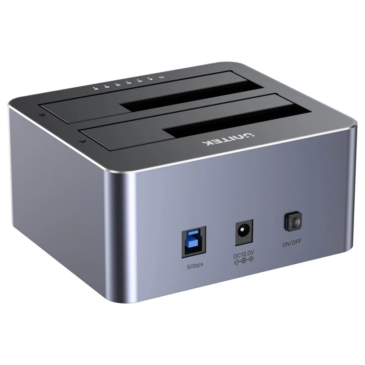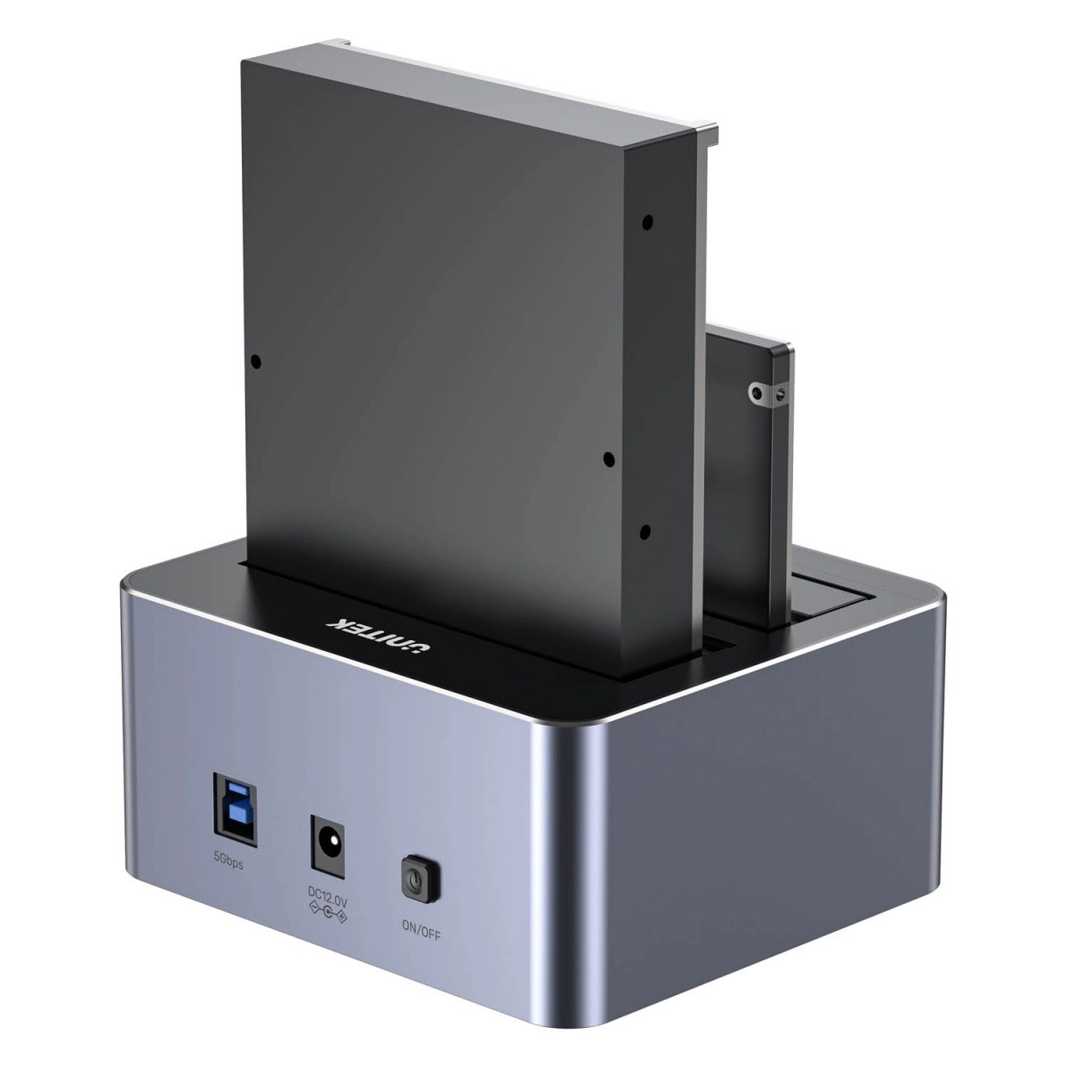 Universal docking- og kloningsstation fra UNITEK til 2,5" og 3,5" SSD/HDD, som gør det muligt at klone diske hurtigt offline uden computer og bruge dem som eksternt lager via USB 3.0 (5 Gbps). Understøtter kapacitet op til 40 TB, SATA I/II/III, teknologierne UASP og TRIM, tilbyder hurtig overførsel op til 485 MB/s, LED-indikering af forløb og strømbesparende standby-tilstand.