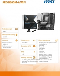 Kompakt og kraftfuldt MSI PRO B860M-A WIFI bundkort til LGA 1851-sokkel tilbyder support til Intel Core Ultra, hurtig DDR5-hukommelse, PCIe 5.0 og M.2, avanceret køling med Frozr Guard samt moderne netværksteknologier inklusive Wi‑Fi 7, 5G LAN og Thunderbolt 4. Takket være det gennemtænkte EZ DIY-design og funktionerne Core Boost, Memory Boost og Audio Boost får du stabil ydeevne, nem installation og klar lyd til både arbejde og spil.