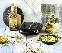 Den kraftige effekt på op til 1600 W fordeler varmen jævnt, indikatoren informerer om klar-til-bagning, og det robuste bakelitkabinet med varmeisolerede greb sørger for behagelig og sikker brug. Låsemekanismen holder pladerne tæt sammen for ensartet bagning.