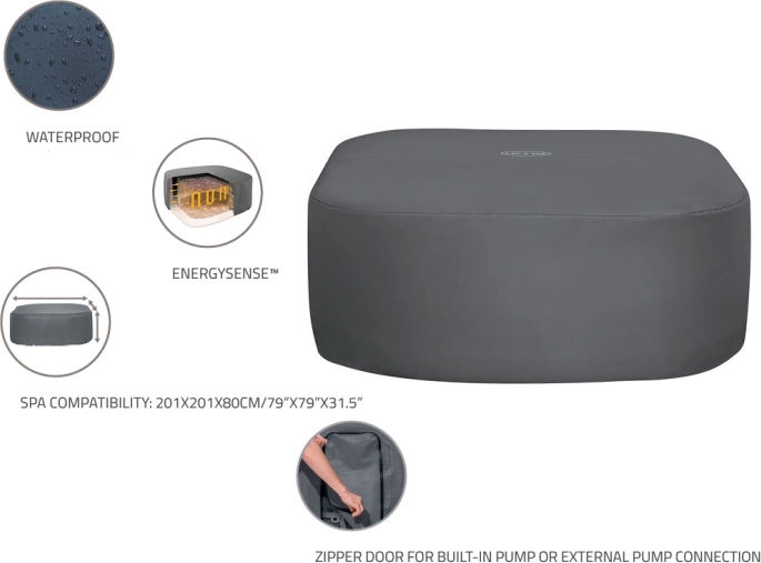 Det termiske overtræk til firkantede spabade med mål på 2,01 m x 2,01 m og en højde på 80 cm er en ideel løsning til at øge effektiviteten og beskyttelsen af dit spabad. Takket være det dobbeltlagede termiske isolering sparer overtrækket markant på energien.