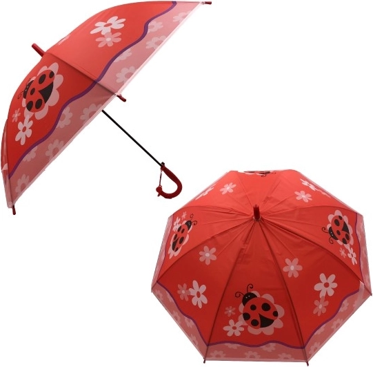 Sommerfugle, ugler, hajer og mariehøns – det farverige mix af motiver gør paraplyen til et populært tilbehør i regnvejr. Varianten vælges efter tilgængelighed.