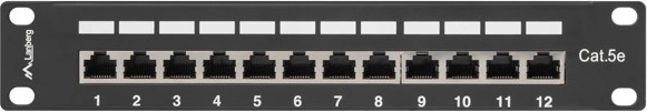 Professionelt patchpanel med 12 skærmede RJ‑45-porte i kategori 5e til 10" rack, som tilbyder pålidelig terminering og organisering af kablingen. Understøtter T568A/B-standarder, har tydelig portnummerering og en højde på 1U for nem integration i fordelingspunkter.