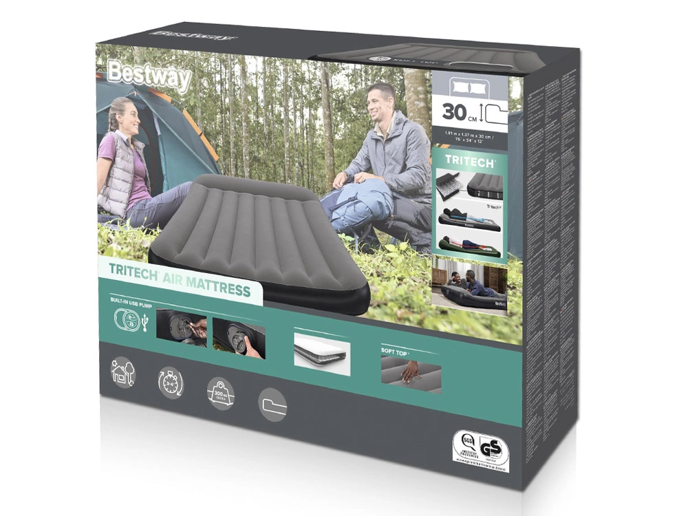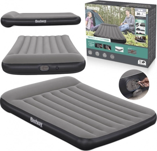 Dobbelt oppustelig madras BESTWAY TRITECH tilbyder høj holdbarhed, stabil støtte og hurtig oppumpning på 3–4 minutter takket være den indbyggede USB‑pumpe. Den integrerede pude, blød overflade der forhindrer sengetøjet i at glide, og bæreevne op til 300 kg gør den ideel til hjemmet, gæster og camping.