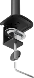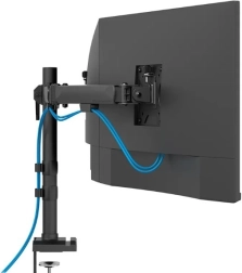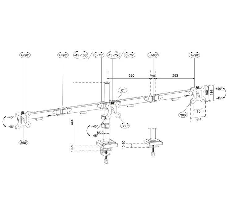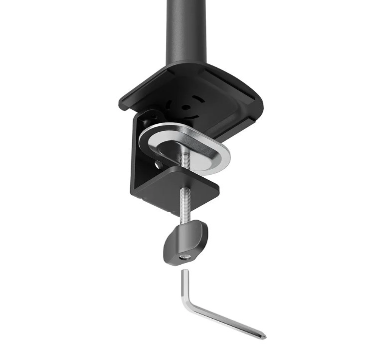 Holderen er udstyret med en 180° stopmekanisme for sikker placering tæt på vægge og en solid svejset base for maksimal stabilitet. Derudover holder det indbyggede kabelhåndteringssystem skrivebordet organiseret og rent og giver plads til din telefon.
