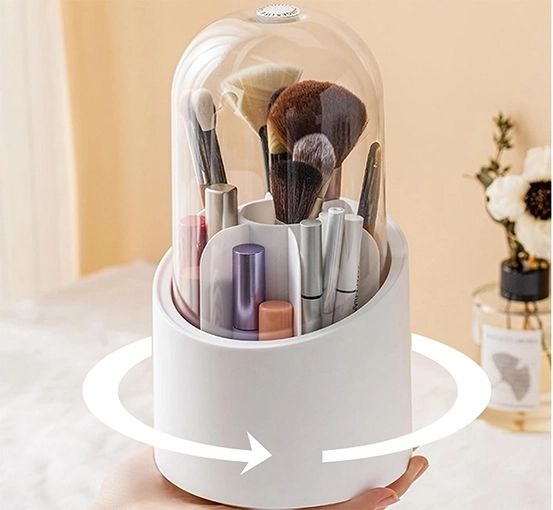 Hold dit sminkebord perfekt organiseret. Denne kompakte organizer har en 360° roterende base, et gennemsigtigt låg mod støv og 7 rum til børster, læbestifter og småting. Holdbar plast og minimalistisk design passer smukt ind i ethvert badeværelse eller soveværelse.