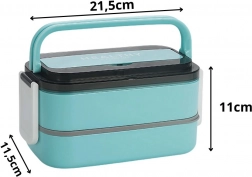 Boksen er lavet af sikre materialer til kontakt med fødevarer, er let at rengøre og kan bruges i mikrobølgeovn (fjern øverste og nederste låg før opvarmning). Et praktisk bestiksæt er opbevaret i låget, så du har alt ved hånden.