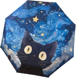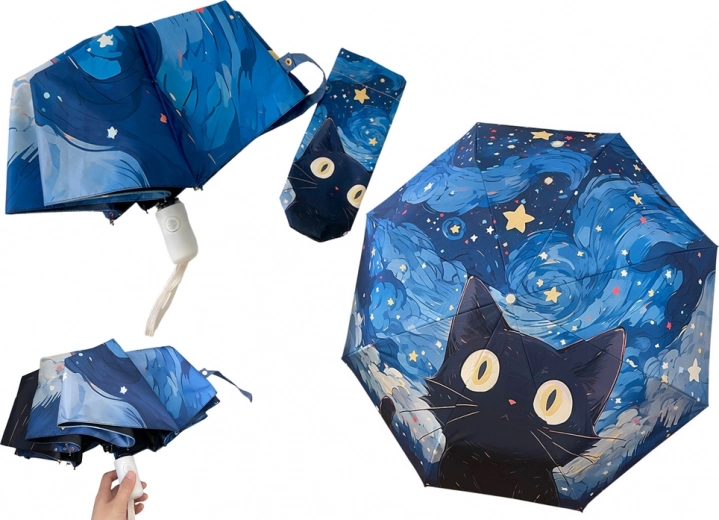 Automatisk sammenfoldelig paraply er det ideelle valg til daglig brug og rejser. Takket være den robuste og lette konstruktion sikrer den lang levetid og modstand mod kraftige vindstød. Denne paraply tiltrækker opmærksomhed med sit unikke design med motivet af en sort kat på en blå himmel.