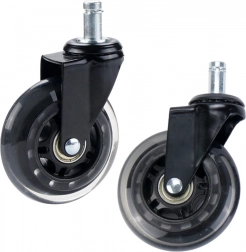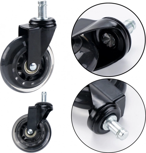 Gummihjul med en blød og fleksibel overflade er ideelle til trægulve, paneler, laminater, fliser og tæpper og beskytter dem mod skader. Den stabile metalkonstruktion i hvert hjul giver høj modstandsdygtighed med en bæreevne på op til 50 kg, hvilket giver pålidelighed selv ved intensiv brug i kontor- og gamerstole.