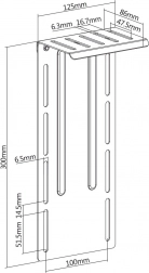 Universel kompatibilitet med standard VESA-huller 100x100 mm sikrer enkel installation. Højdejustering og mulighed for montering med hylden fremad eller bagud gør det muligt at tilpasse placeringen af det monterede udstyr efter dine behov.