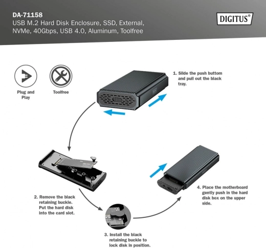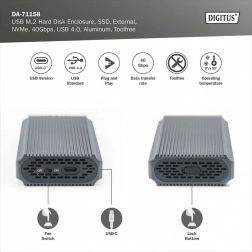 Kabinettet understøtter M.2-moduler i formaterne 2230, 2242, 2260 og 2280, hvilket sikrer kompatibilitet med en bred vifte af SSD-diske.