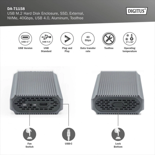 USB 4.0 kabinet til M.2 NVMe SSD muliggør hurtig dataoverførsel på 40 Gb/s, hvilket sikrer jævn drift og lynhurtig kopiering af filer. Kompatibel med ældre USB-versioner, nem installation uden værktøj og understøttelse af op til 8 TB lagerplads.