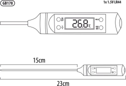 Høj kvalitet og præcision gør dette stifttermometer til et fremragende værktøj til måling af temperaturen på kød, kager, supper, saucer, vand, mælk, desserter og andre retter. Termometeret er udstyret med en indstiksprobe, som blot skal stikkes i eller nedsænkes i retten for hurtig og nem aflæsning af temperaturen på det letlæselige display. Det er velegnet både til hjemmebrug og til brug i restauranter og andre gastronomiske faciliteter.