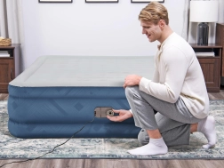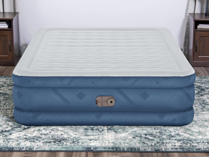 En integreret elektrisk pumpe 220–240 V puster madrassen op på cirka 3 minutter. Til steder uden strøm kan der også bruges en manuel eller fodpumpe. En sikkerhedsventil hjælper med at holde trykket og forhindrer utilsigtet luftudslip. Den maksimale belastning er 350 kg, hvilket sikrer pålidelighed selv ved intensiv brug.