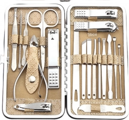 Dette alsidige sæt tilbyder alt, hvad du behøver til perfekt pleje af hænder og fødder. Kvalitetsværktøj i stainless steel sikrer rene klip, præcis filing og skånsom pleje af neglebånd. Det stilfulde beige etui holder alting overskueligt organiseret og er ideelt til transport.