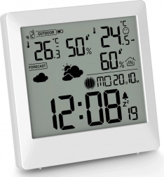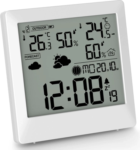 Vejrstationen fungerer også som et praktisk ur med 12/24-timers format, viser ugedage, månens faser og tilbyder alarm med snooze-funktion.
