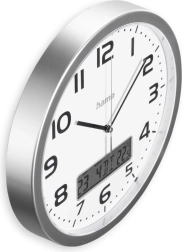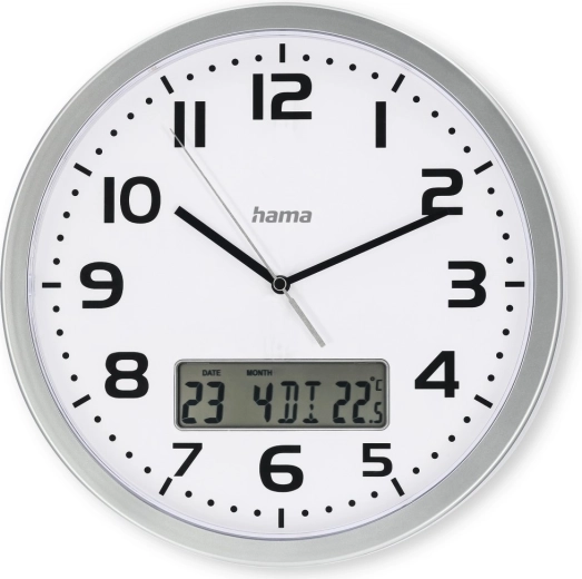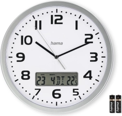 Stilrent vægurm med en diameter på 30 cm, der forener traditionel analog tidsvisning med et praktisk digitalt display, som viser dato og den aktuelle rumtemperatur. DCF-radiostyret tid sikrer præcision uden behov for manuel indstilling og ved skift til sommertid.