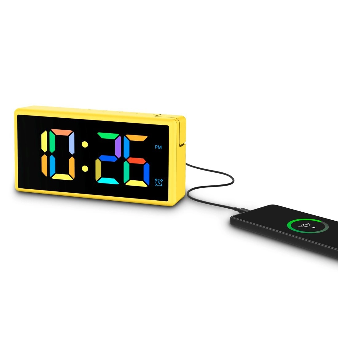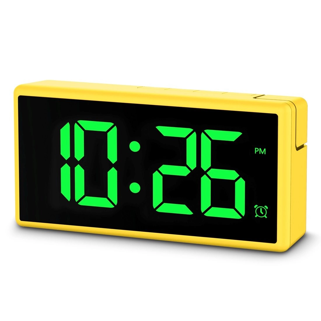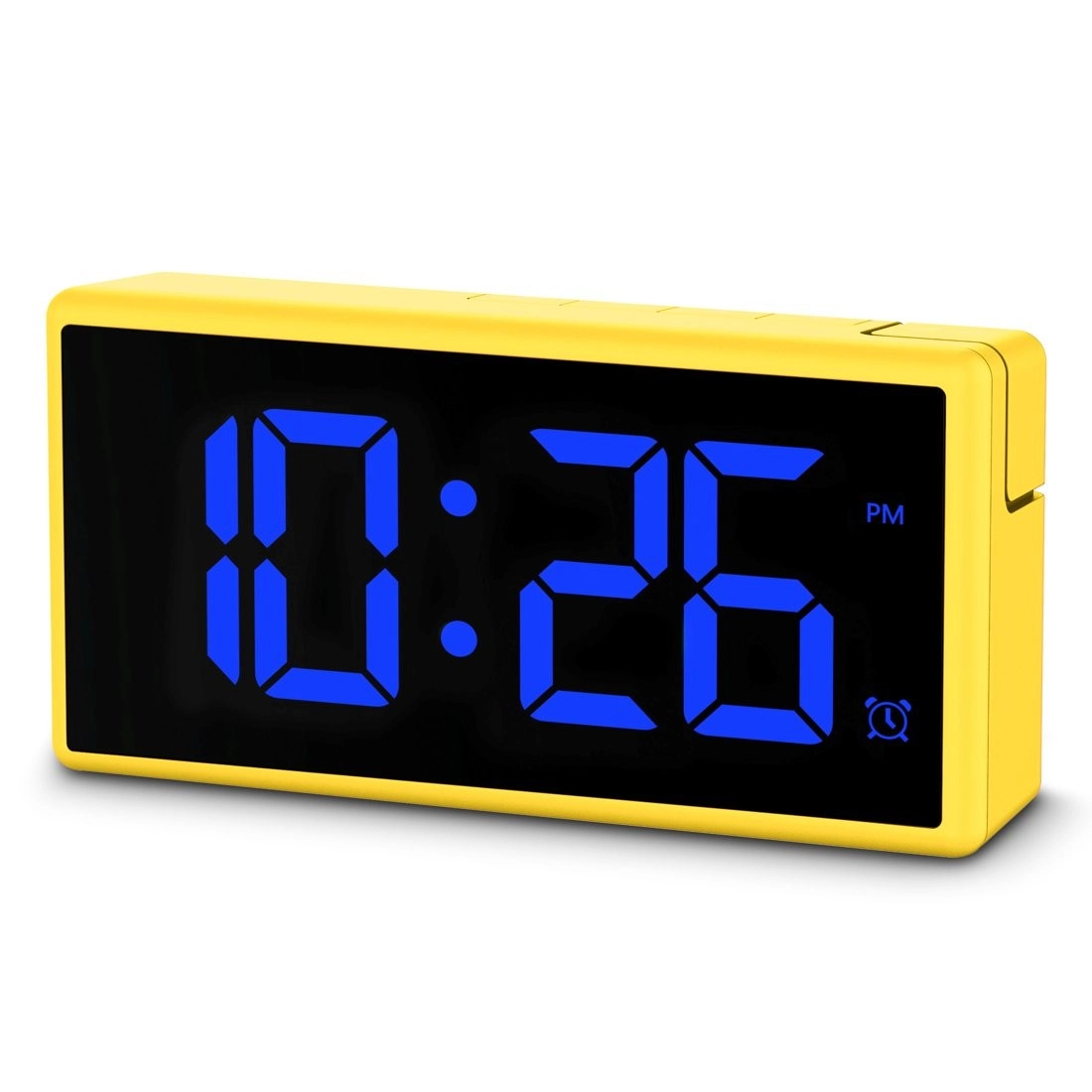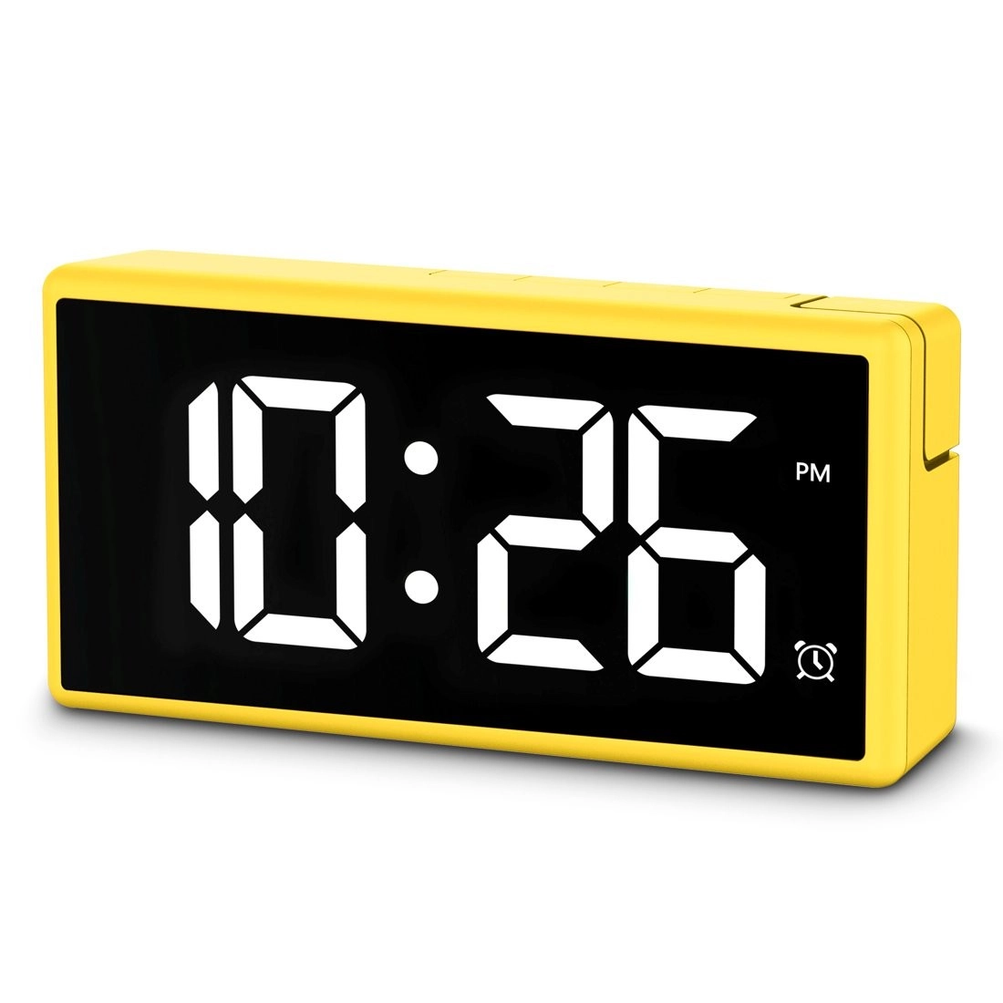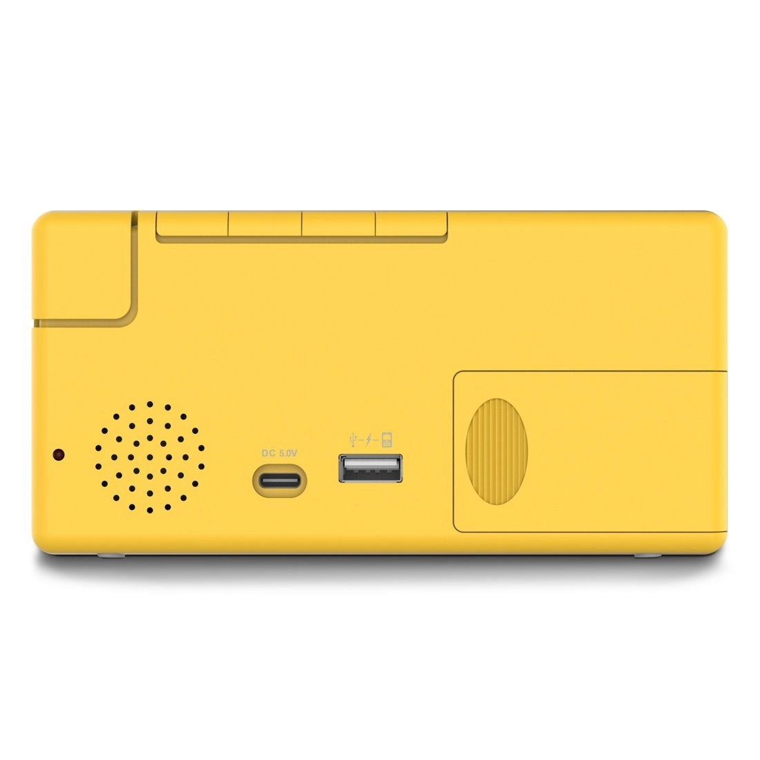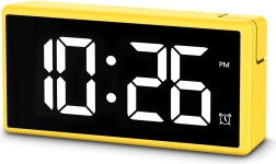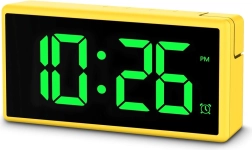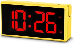 Stilfuldt og praktisk digitalt vækkeur i energisk gul farve med stort, multifarvet LED‑display, programmerbar alarm og USB‑port 1 A til opladning af telefon. Takket være 4 lysstyrkeniveauer inkl. fuld slukning under opladning, skift mellem 12/24 t, slumrefunktion og justerbar alarmstyrke (lav/normal/høj) er det ideelt til både soveværelse og børneværelse.