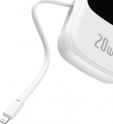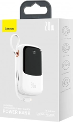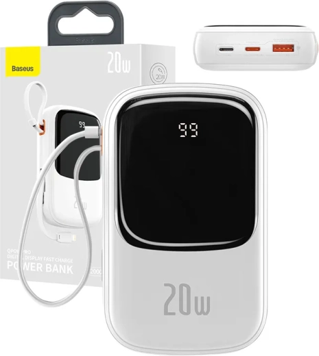 Baseus Qpow Pro er en praktisk og rummelig powerbank udstyret med indbygget Lightning-kabel, USB-C og USB-port. Den gør det muligt at genoplade op til tre enheder samtidigt med en udgangseffekt på 20 W.