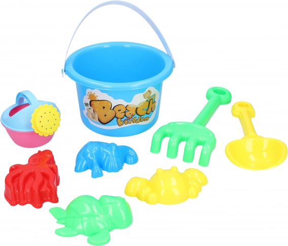 - 8 dele i sættet: spand med motiv, skovl, vandkande, rive og 4 forme