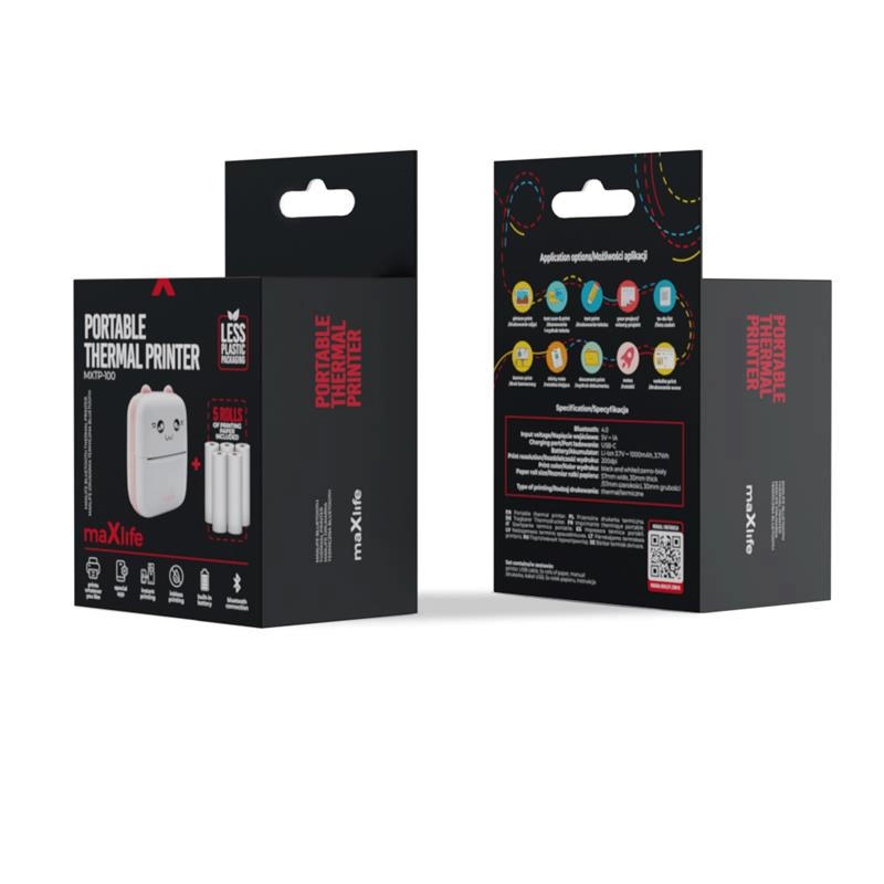 Maxlife termisk Bluetooth-printer er en kompakt og bærbar enhed, der er ideel til en lang række printprojekter – fra fotos til tegninger, noter, etiketter, klistermærker og meget mere. Takket være termisk printteknologi er der ikke behov for at skifte blæk. I pakken medfølger fem ruller termisk papir, hvilket gør udskrivning nem og økonomisk.