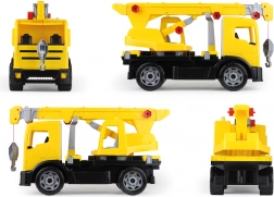 For stabil håndtering er der 4 udtrækkelige sidestøtter og kiler til at sikre hjulene mod bevægelse. Kranens bom drejer 270° og når ved udtræk en samlet længde på op til 115 cm. Den robuste plastkonstruktion er ideel både på børneværelset og i haven.