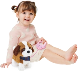 En sød plyshund på 22 cm, som efter tilslutning af et kabel med fjernbetjening kan gå, gø, vifte med halen og bevæge hovedet. Betjeningen er enkel: tryk på snoren for at starte gangen, berør hovedet for at aktivere effekter, og efter en klappen går hunden igen. En fantastisk interaktiv legetøjshund til børn, der både underholder og stimulerer sanserne.