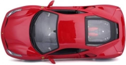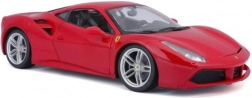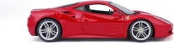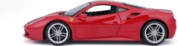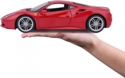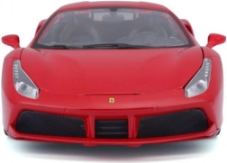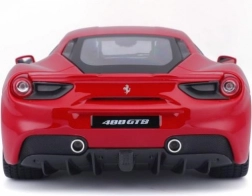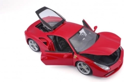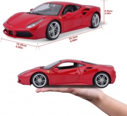 Detaljeret udførelse af den røde Ferrari 488 GTB med autentiske proportioner, logoer og sportsfælge i skala 1:18.