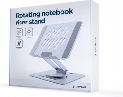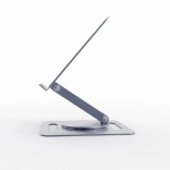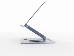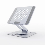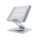 Universelt stativ til bærbare computere op til 15,6″ i elegant grå farve med trinløs højdejustering, 360° rotation og stabil metalkonstruktion. Den åbne platform sikrer fremragende køling, mens silikonepuder og en sikkerhedsliste holder enheden sikkert på plads. Takket være den sammenklappelige konstruktion er det ideelt både på skrivebordet og på farten.