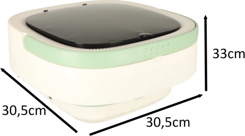 - Dimensioner udfoldet vaskemaskine: 30,5 cm x 30,5 cm x 33 cm