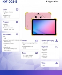 Tabletten Krüger&Matz FUN 1008 giver en unik oplevelse for børn takket være det pink design og beskyttende elementer. Skærmen med opløsning 1280 x 800 pixel og billedformat 16:9 tilbyder klare og naturtro farver takket være IPS-teknologien. Den er ideel til børn på grund af de brede betragtningsvinkler.
