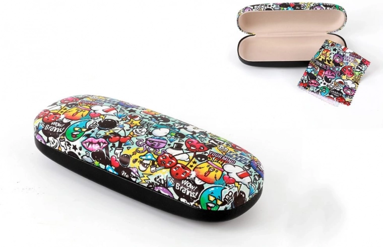 Leder du efter praktisk beskyttelse til dine styrke- eller solbriller? Dette etui med graffitimotiv kombinerer moderne design og pålidelig beskyttelse. Indeni finder du en blød foring, der minimerer risikoen for skrammer og skader på glassene, samt en mikrofiberklud til nem og skånsom rengøring.