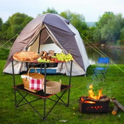 Sammenklappeligt campingbord er designet til at være din rejseledsager. Det er let og kompakt, hvilket gør det til et ideelt valg for alle, der tilbringer tid udendørs. Det giver en behagelig plads til mad, afslapning eller underholdning og optager meget lidt plads, når det er foldet sammen. Vejrbestandigt, så du kan tage det med i bjergene, til søen eller på stranden uden bekymringer.