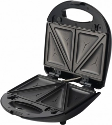 For komfort og sikkerhed er der en termostat for optimal bage-/stegningstemperatur, lyskontakter for status og klar-til-brug samt en låseklap på håndtaget for jævnt pres. Gummibelagte skridsikre fødder holder enheden sikkert på plads, og det termisk isolerede kabinet bliver ikke overdrevent varmt under brug.
