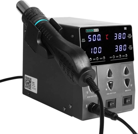 Sugon 212 kombinerer en varmluftstation og T12-loddekolbe, hvilket gør den til et komplet værktøj til reparation og montage af elektronik. Den muliggør ikke blot præcis lodning, men også nem aflodning og montering af SMD‑komponenter. Tre programmerbare knapper lader dig gemme optimale indstillinger for temperatur og luft.