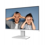 Skærmen er udstyret med en elegant hvid ramme og stander, som passer perfekt ind i moderne kontor- og boligmiljøer.