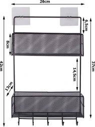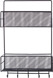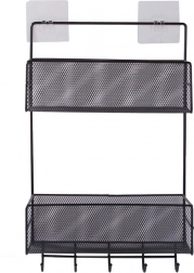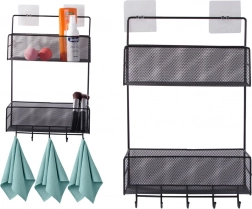 Denne multifunktionelle vægorganizer i lakeret metal er en ideel løsning til overskuelig og elegant opbevaring af hverdagsting. De to ventilerede kurvehylder rummer kosmetik, rengøringsmidler, krydderier og små accessories, mens de nederste kroge holder håndklæder, viskestykker eller nøgler lige ved hånden. Takket være borefri montering kan den nemt fastgøres på en glat overflade.