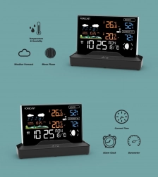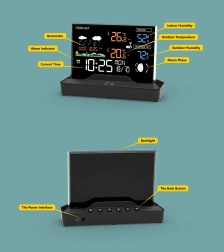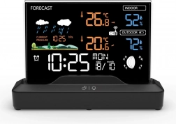 Med den trådløse sensor med rækkevidde op til 30 m får du aktuelle temperatur- og fugtdata fra både inde- og udemiljø. Barometer og indbygget vejrudsigtsfunktion for 12–24 timer gør dagens planlægning lettere. Derudover findes alarm med snooze, kalender og visning af Månens faser.