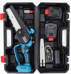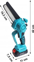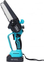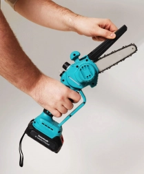 Præsenterer trådløs mini motorsav, som vil blive din uvurderlige hjælp ved havearbejde og tømreropgaver. Den er udstyret med en moderne børsteløs motor, der sikrer højere effektivitet og pålidelighed under drift.