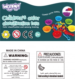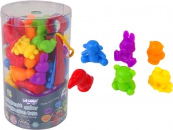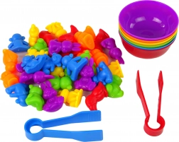 Dette farverige montessori-sæt giver en enkel, men meget effektiv form for læring. Børn hælder figurerne ud på bordet og fordeler dem i skålene efter farve ved hjælp af tænger, hvorved de udvikler hånd–øje-koordination, koncentration og logisk tænkning. Gummifigurerne er behagelige at røre ved og sikre for små børnehænder.