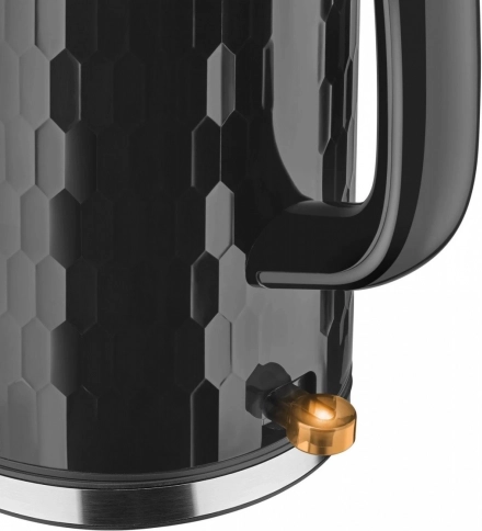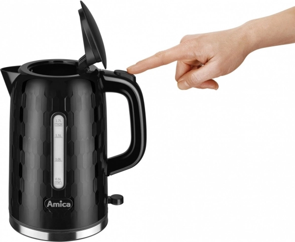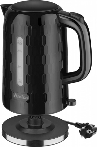 Den moderne Amica elkedel i elegant sort med tekstureret, honeycomb-overflade bliver en pålidelig hjælper til hurtig vandkogning. Med en kapacitet på 1,7 l betjener du nemt hele familien, mens det flade varmelegeme gør rengøringen lettere og fremmer effektiv opvarmning.