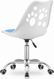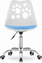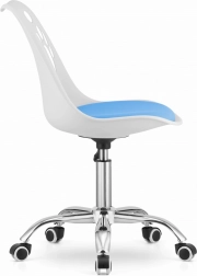 Denne kontorstol kombinerer et moderne look med praktisk funktionalitet. Den hvide og blå kombination frisker enhver indretning op.