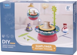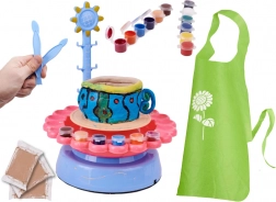 Sættet indeholder en farverig attråværdig drejeskive, der er beregnet til modellering af ler og dekoration.
