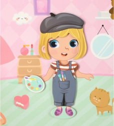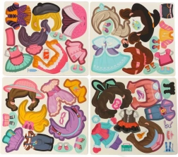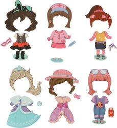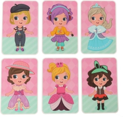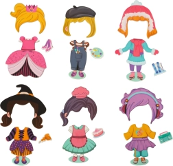 Et rigt sæt af magnetiske outfits, frisurer og tilbehør med forlægskort giver masser af outfits og scener. Perfekt til at øve efter skabelon og til fri kreativ leg.