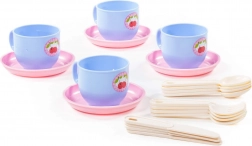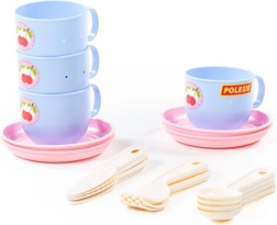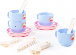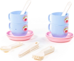 I sættet finder du 4 krus med underkopper og bestik. Alt kan vaskes og er let at rengøre.