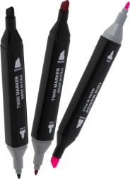 Hver tusch tilbyder en bred, skrå spids til udfyldning af store flader og en fin spids til præcise linjer og detaljer. Du skifter nemt mellem hurtig udfyldning og præcis streg.